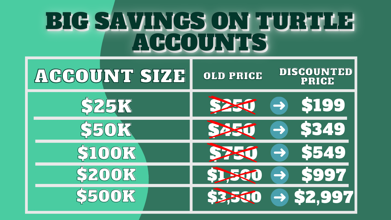 Did you know? Our 1 Phase (Turtle) Accounts just got more affordable! Whether you're eyeing a $25,000 account or aiming for the $500,000 account, there's a deal for you. Plus, enjoy increased daily and maximum drawdown limits and more leverage. Don't miss out—trade smarter today!