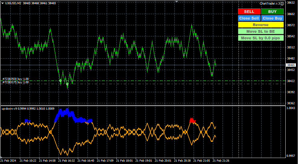 But then this begs the question of exactly when one should exit a buy trade using Up Down V9. Is it a pre-defined target you set yourself in advance? As soon as a streak of red X's appears and then ends? Or when you see only one red X followed by an orange line? These are definitely questions anybody using this indicator in a live setting should be seriously asking themselves.