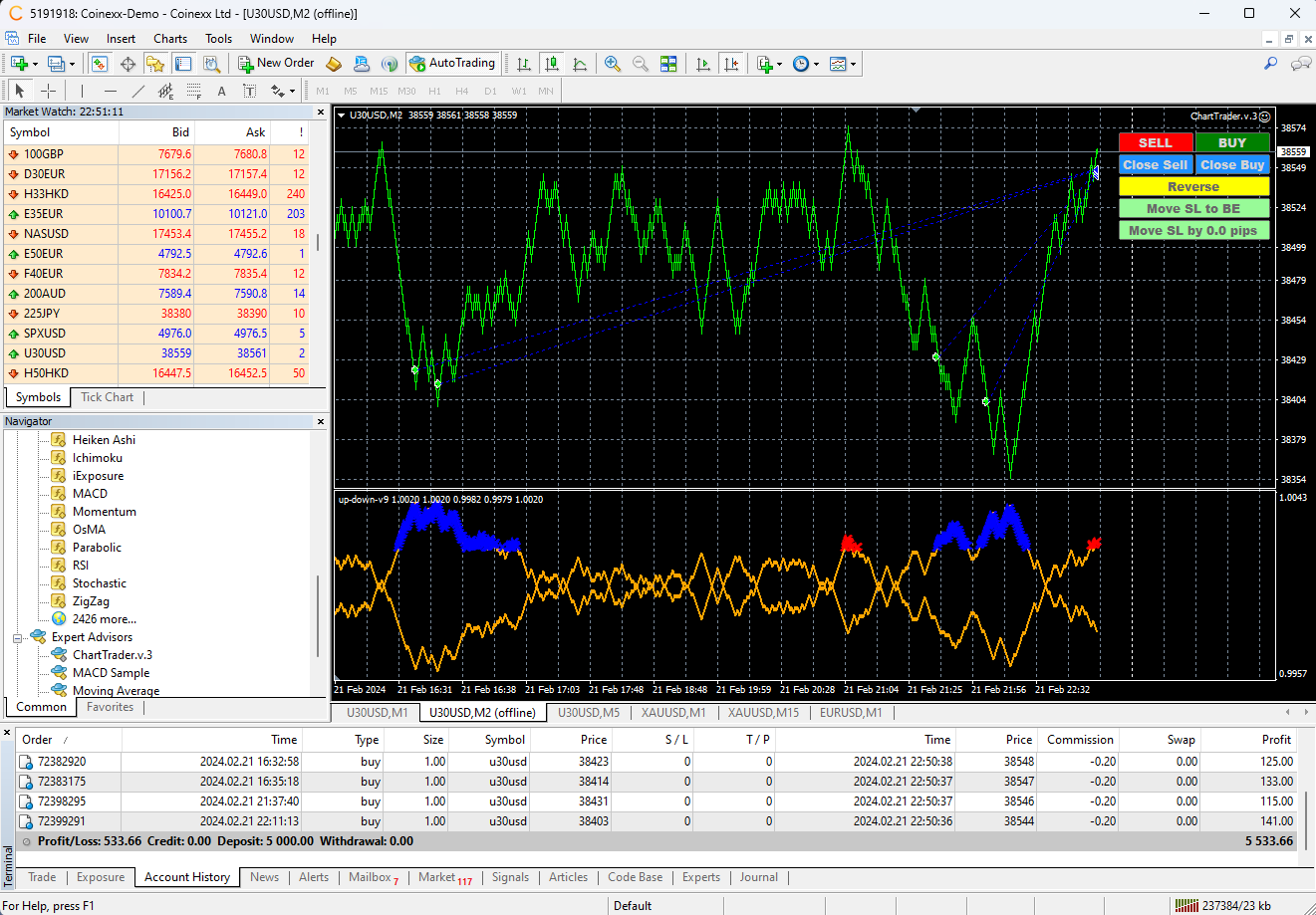 • Trade size: 1 lot per trade, the lowest Coinexx allows me to go, translating to $1 per point (i.e. 30,000 -> 30,001 = $1 in profit on a buy trade)