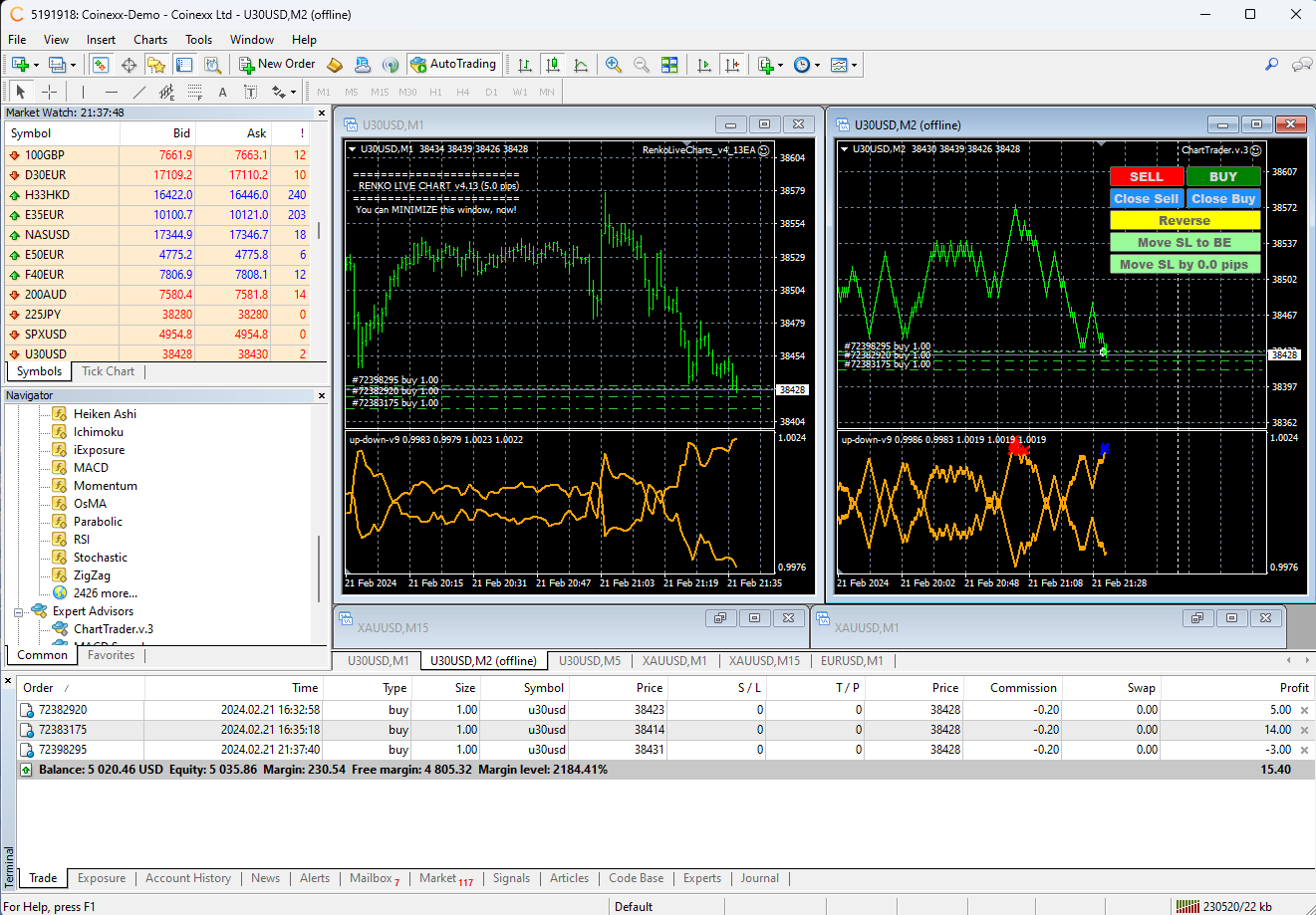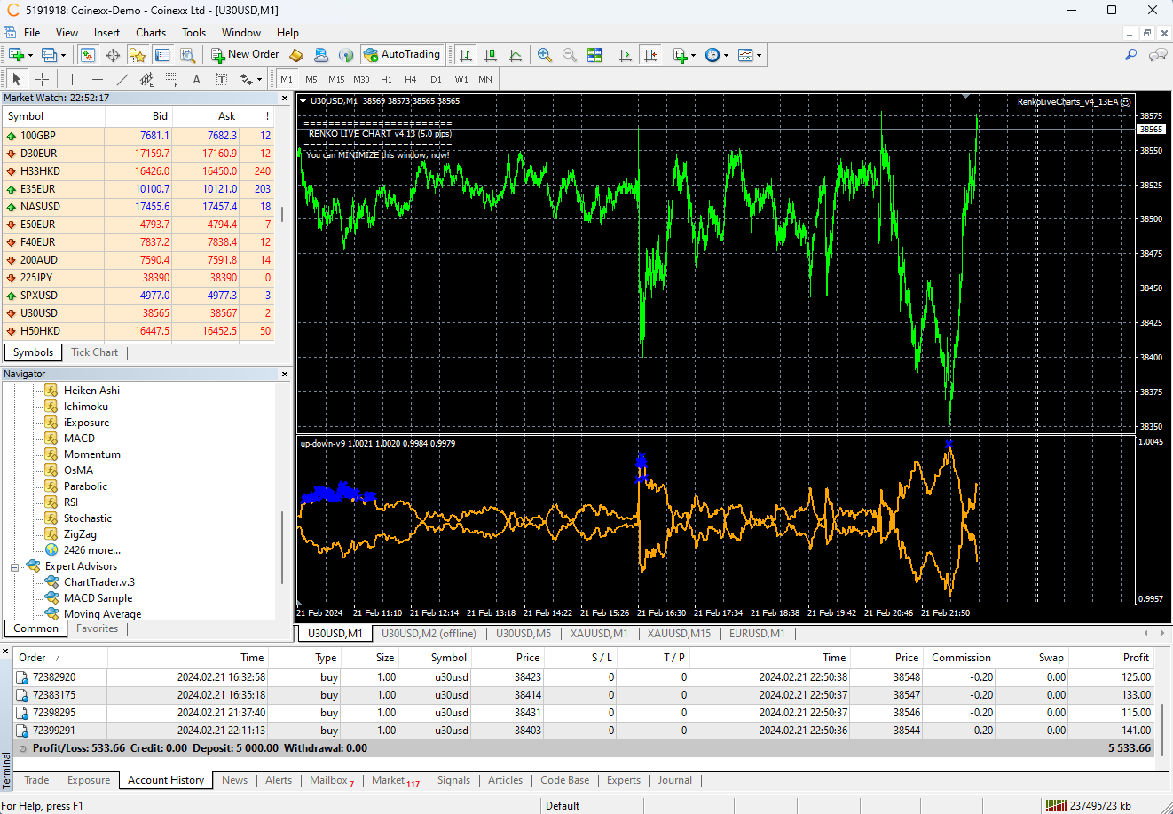 - Timeframe: 1 minute (candlestick) and 5-point Renko boxes (i.e. 30,000 -> 30,005 is one box)
