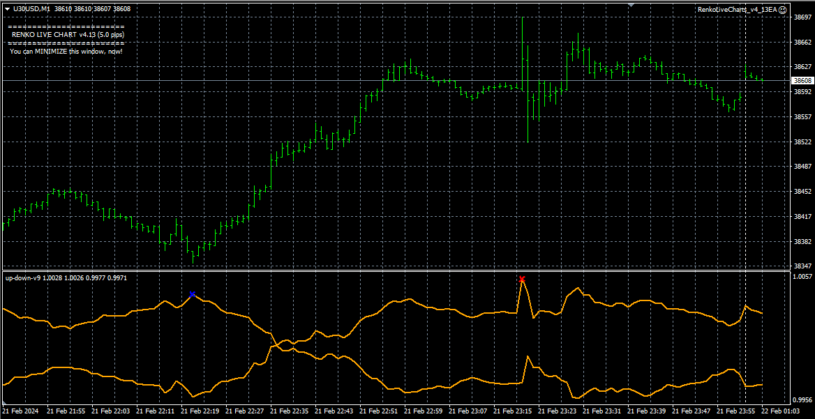 But then this begs the question of exactly when one should exit a buy trade using Up Down V9. Is it a pre-defined target you set yourself in advance? As soon as a streak of red X's appears and then ends? Or when you see only one red X followed by an orange line? These are definitely questions anybody using this indicator in a live setting should be seriously asking themselves.