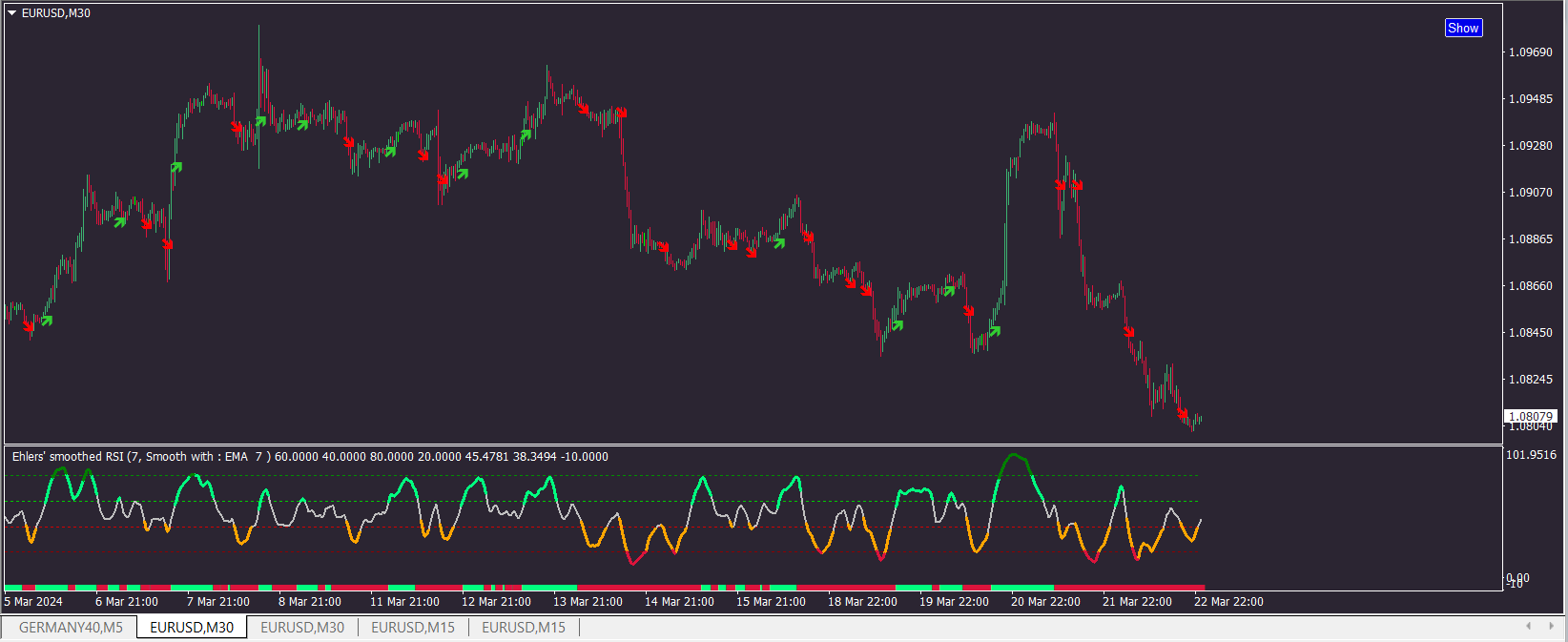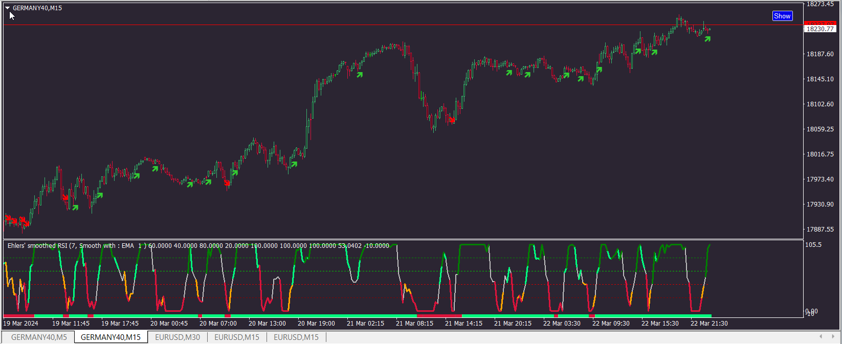 - example: price is above the 200 ema and the rsi crossed below the 30 level and is now exiting the 30 level. Arrow below the candle