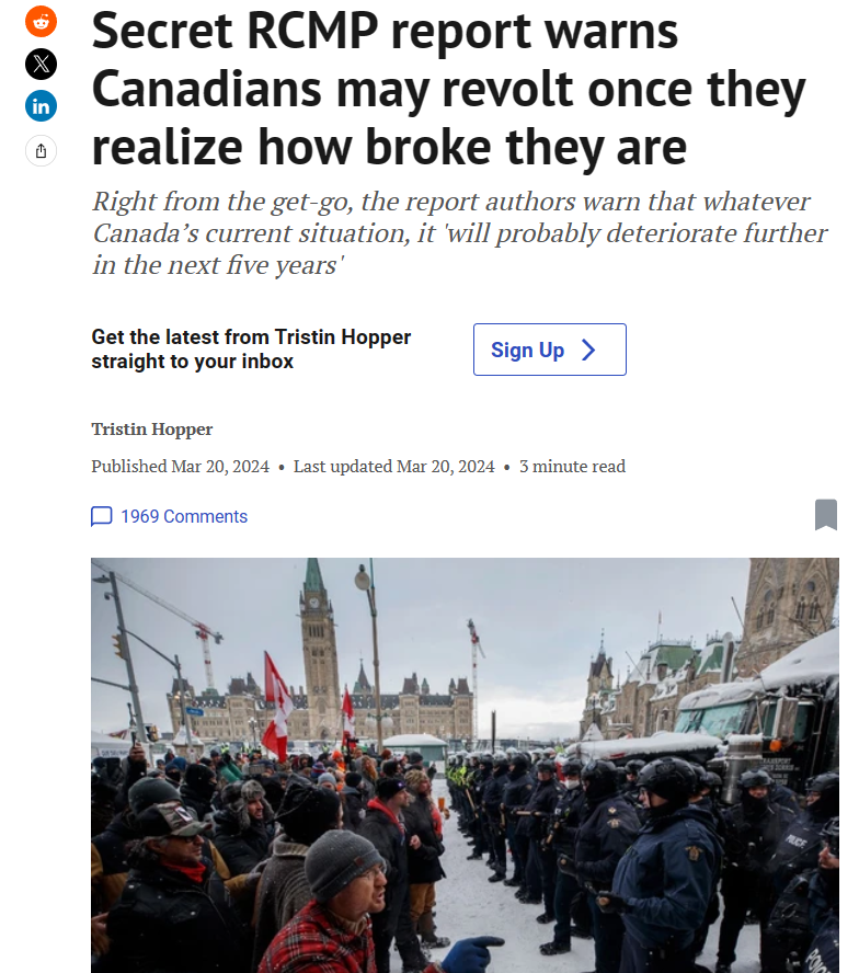 Leaked Canadian police doc warns of social unrest as living standard deteriorate over the next 5 years. (Same could be said for other western countries).