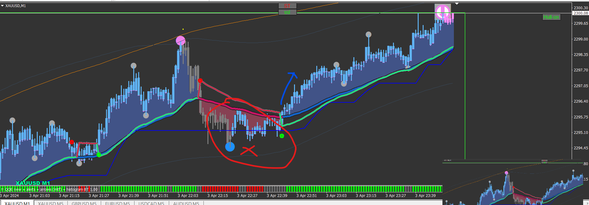 I will appreciate if we can have one that changes the candle colors only when it crosses the EMA in the direction of the BIG arrow.