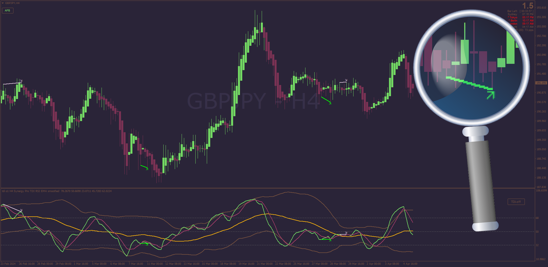 Minor changes were made to the TDI by Dean Malone after it's release in 2005 & saw the final version of the TDI adjusted to suit intraday markets (RSI 10 instead of 13). Now, Mrtools has released an extended version w/ Divergences & 9 RSI choices, here: post1295538649.html#p1295538649