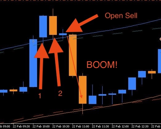 2 . if the next candle changes color (to red), open the short at the close of the candle (see attached photo). The color change is important see second photo:
