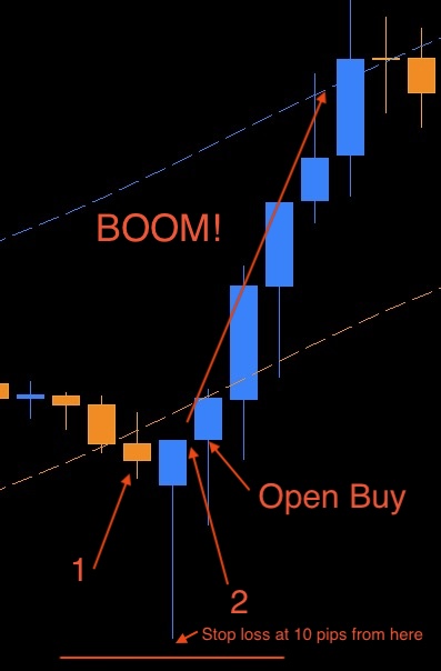 2 . if the next candle changes color (to blue), open the buy at the close of the candle (see attached photo).