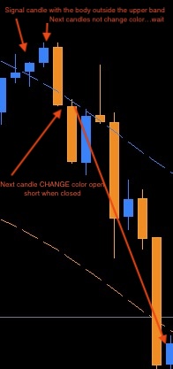 first candle open and close outside the band but the next don't change color , so I wait the next one, change color and BOOM!