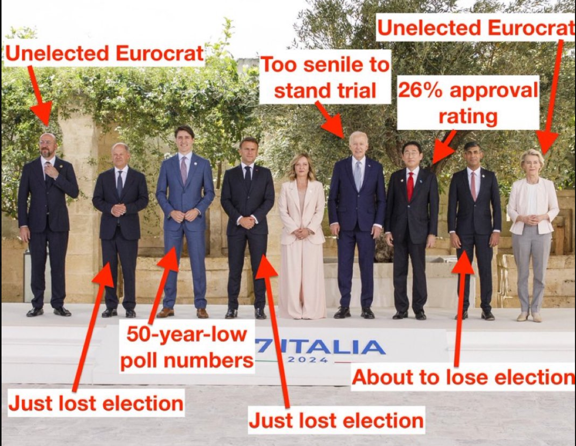 What is also obvious is that the other G7 leaders can see exactly what's happening, they're all keeping one eye on him, half are sniggering and the other half are trotting after him trying to keep him out of trouble.