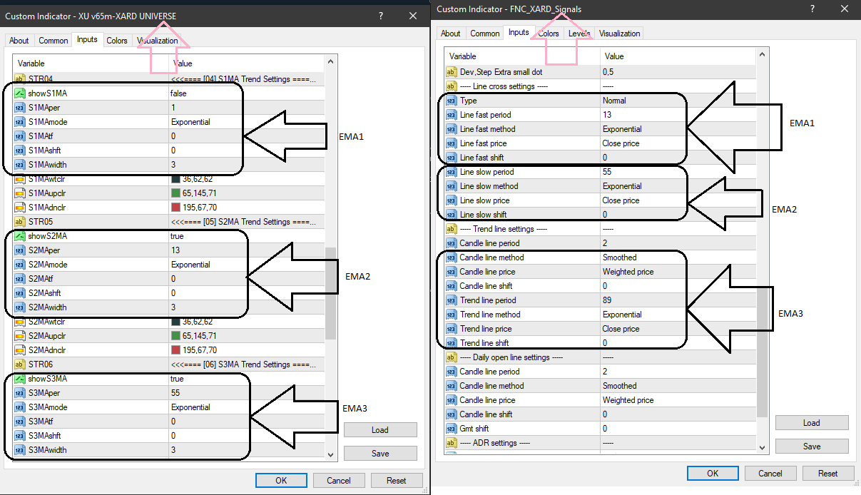 With test i made don´t need change anything (except the values of EMAs), but in my case i preferred use v65m because i like check all the template, like the Painel1 and ZigZag1 and ZigZag2, is very important to take my actions, but is cool the interaction of two systems.