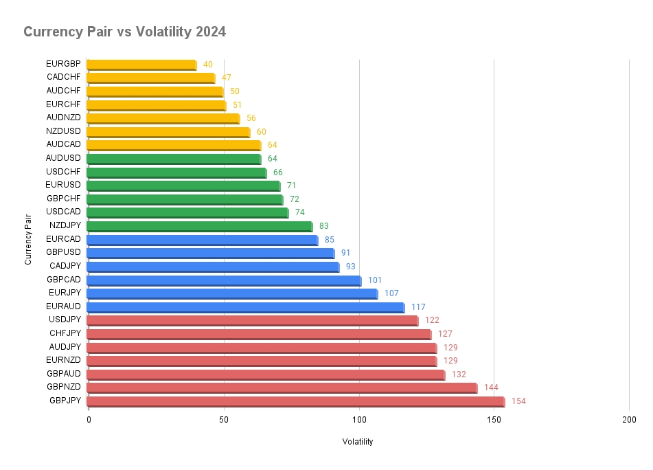 • Least Most Volatile Currency pair in 2024 is EUR/GBP which averaged 40 pips per day in movement