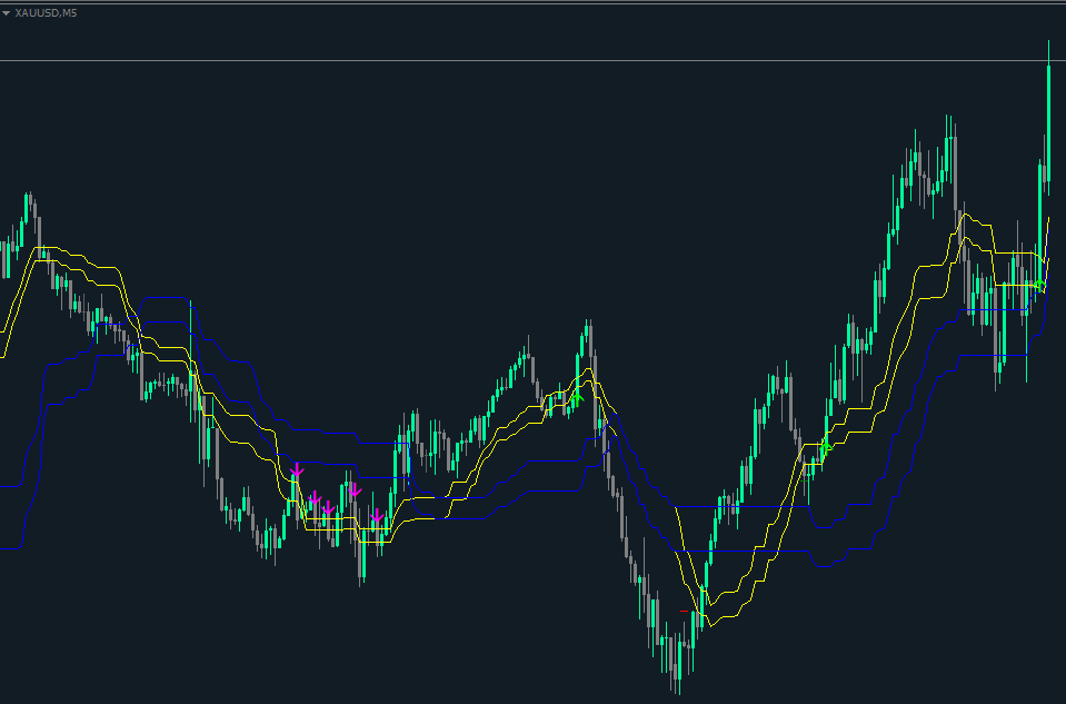 Arrows: Buy signals (green/lime) appear at the low of the candle, sell signals (red/magenta) appear at the high of the candle.
