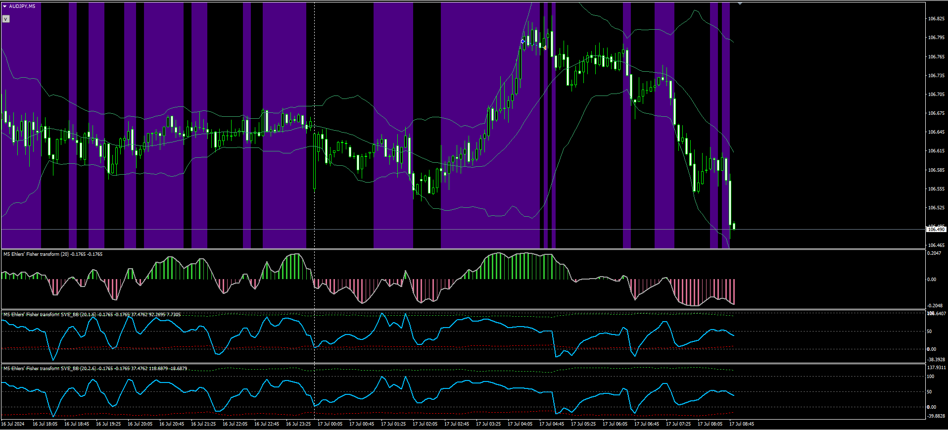 The EFT indicator modifies the price into an almost Gaussian Normal Distribution bell-shaped curve, so when Bollinger Bands standard deviation levels are applied to the EFT, the signals produced should be more reliable than regular Bollinger Bands applied to the price.