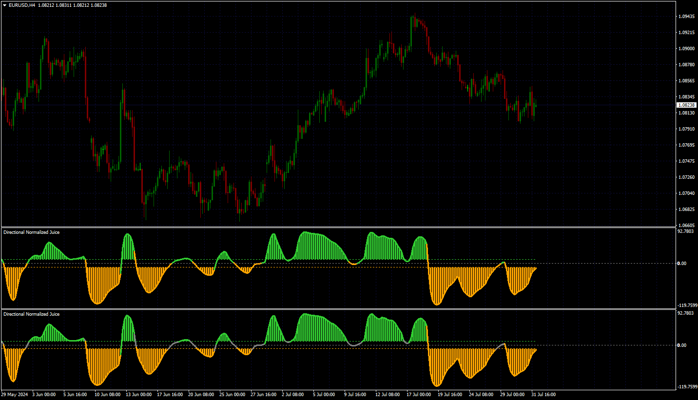 Traditionally, "Juice" is not a directional indicator, but rather a tool to gauge fluctuations in market volatility, however, this indicator has been made "directional" and can be used for signals into the trend.