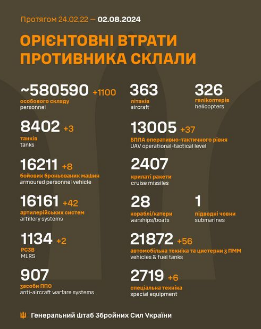 The total combat losses of the enemy from 02/24/22 to 08/02/24 were approximately: