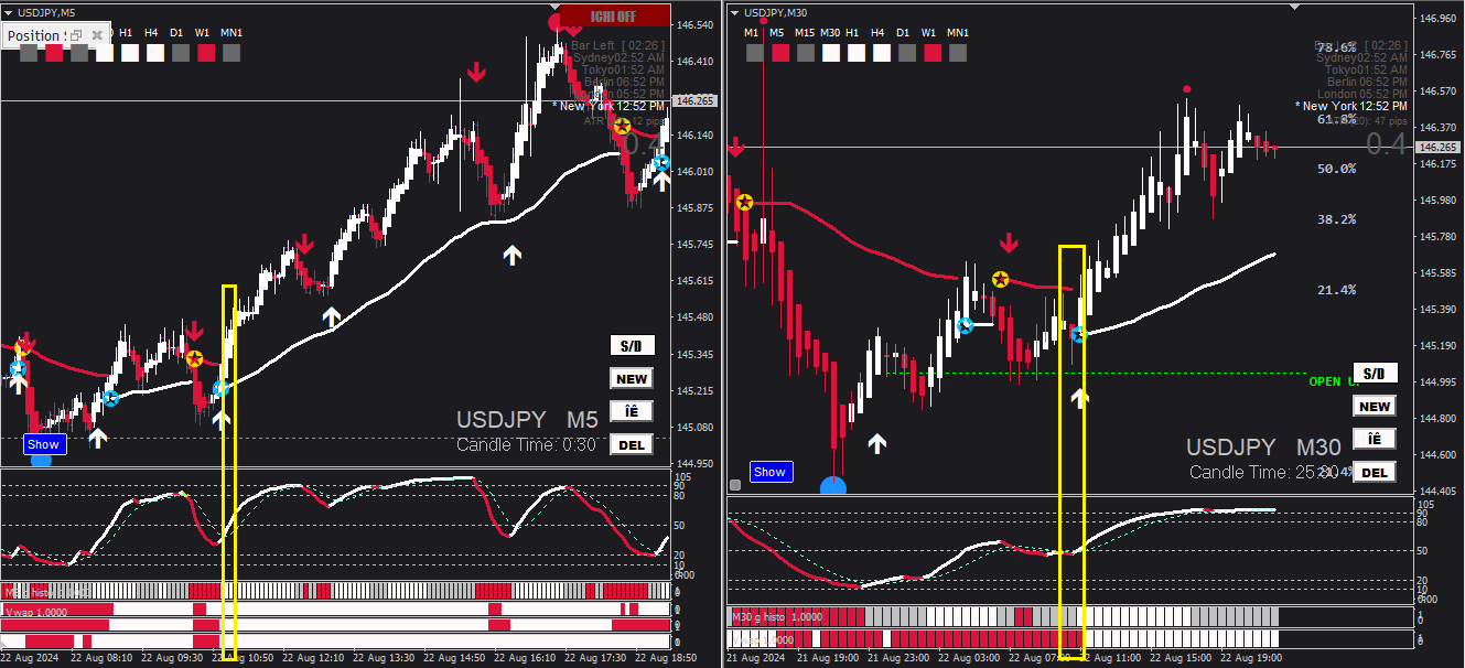 Excuse my ignorance and my insistence. I understand that the highest TF to operate at 5M is 30M. But when looking at the 30M chart I still see that the last closed candle is red. Is there something else I'm missing? If it is by structure, it is true that there are two previous higher highs at 30M, creating a CHOCH at 5M. Do you rely on that or do you have another opinion?Cagliostro wrote: Fri Aug 23, 2024 4:25 am HI Vertigo - if you set the chart on 1H you lose two histo lines. The max TF you can use with this specific configuration of the system is 30M. The last two histo indicators are higher TF bias monitored by Gann. If you trade on 5M you don't need to check other TF unless you want to verify the alignment of Zigzag trend. Possibly, if I have time, I can include settings for higher TF in the next version.