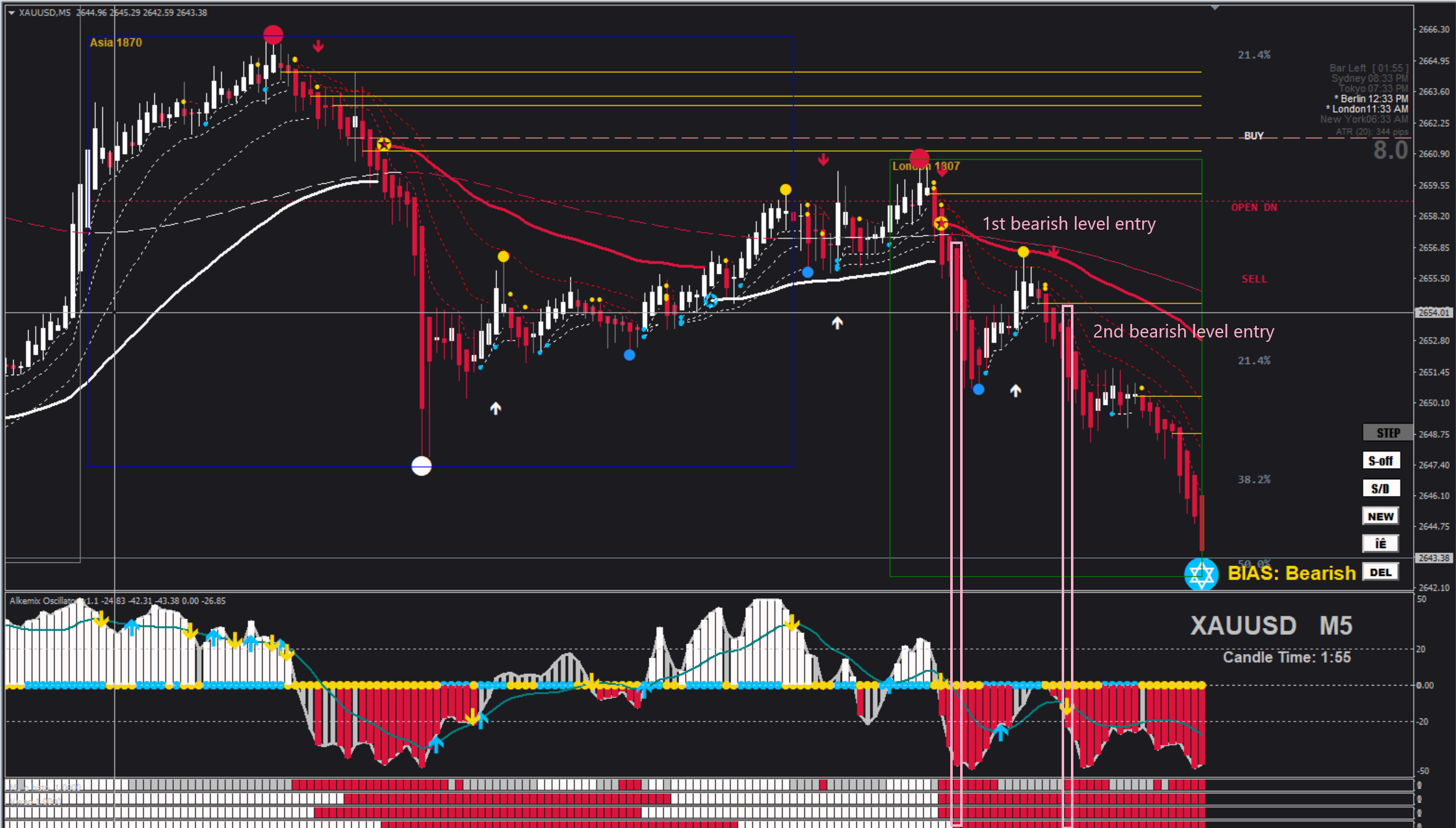 Below an example how to enter multiple positions (pyramiding) using the black levels. The two entries happened at the confirmation of the bearish levels, after a pullback of the price. The rest is classical rules, alignment between MA, Arrows and bottom indicators.