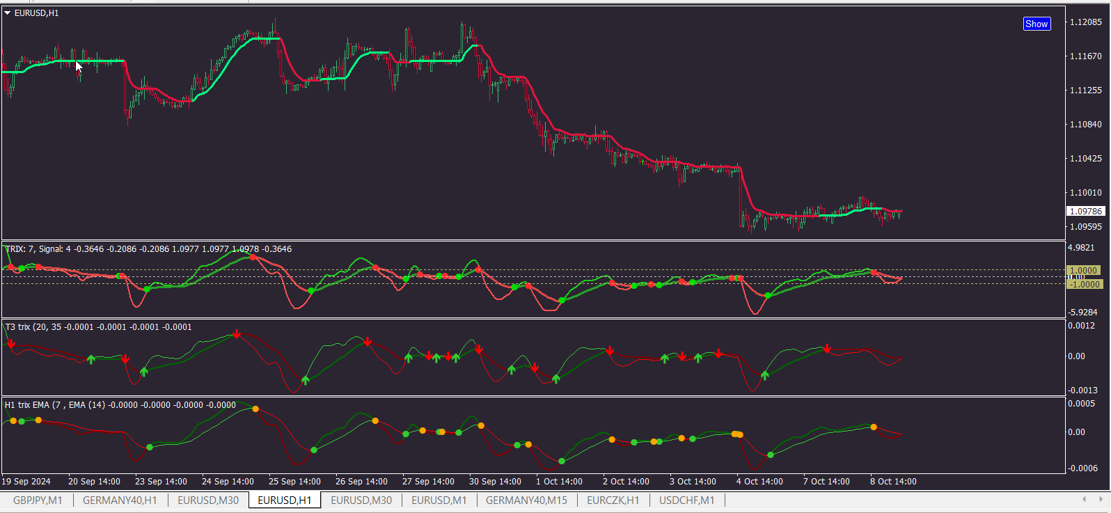 nine wrote: Wed Oct 09, 2024 7:02 am thanks for the arrows on the dmx i am working on a signal confirmation/filter where the dmx arrows align with a chart signal and a signal from the TRIX.crossover indicator like pictured. i searched and could not find the mql/source code for it. the closest i found was the t3 trix indicator. the crossover is the window with the dots in the picture and the t3 is the one below it. i am hoping to replicate it or obtain a suitable alternative perhaps with the t3. the t3 is close i may be able to fine tune the settings though i think the crossover indicator may be better suited for my uses. i think its the same thing only the basic version without additional smoothing. i have included the inputs in the post. i have been trying to use the simplest or most basic forms of the code because mostly my uses are geared towards embedding the code into an Expert. i think the t3 was the most basic version of the code i could find that was similar. on to my request.