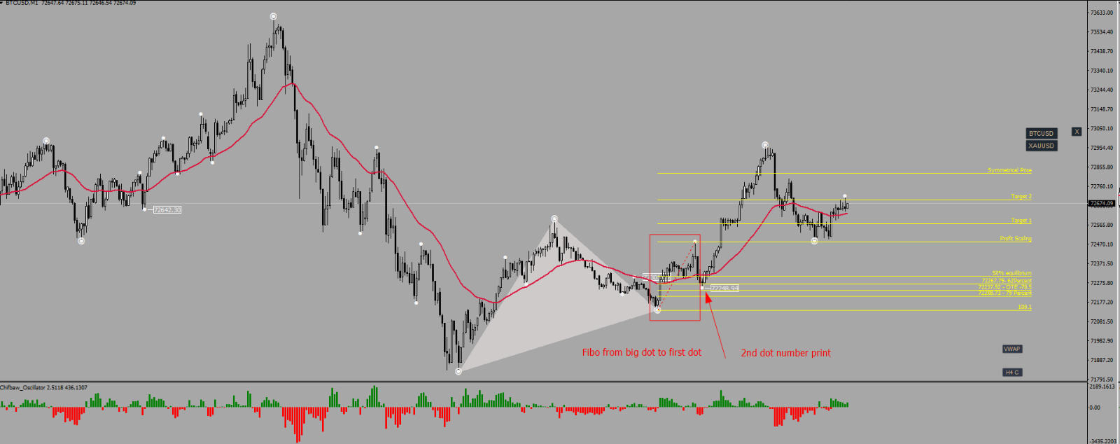 Great idea! Are you using Fibonacci once the 2nd dot with number appears on the chart?