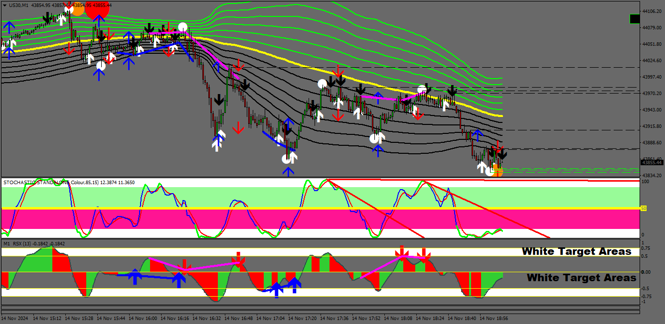 This is how I would trade this chart - the first illustration I have drawn a trapline over the stochs indicator and the second illustration later in the afternoon the result with the exit being at the white dot whilslt the stochs indicator is in the overbought area. This second illustration is the patient wait the next trade.