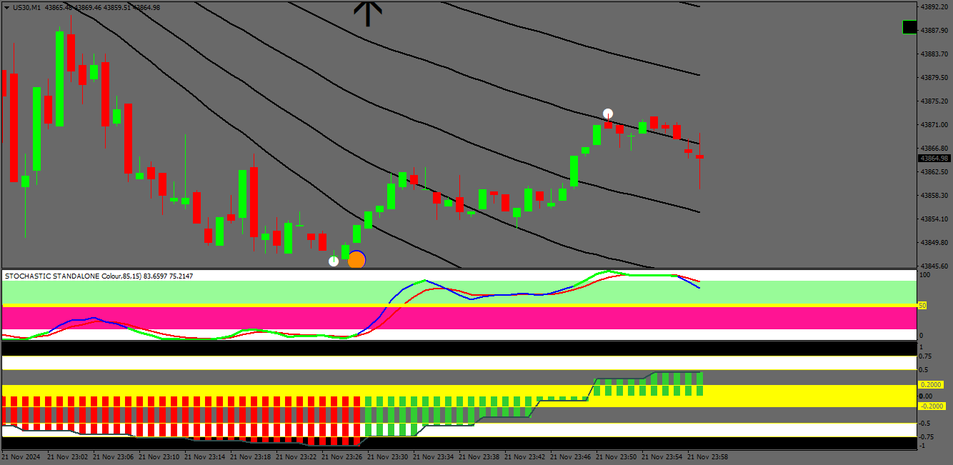 As you can see by the chart, the arrow on the 1m trading chart is too far away and the replacement of this with a verical line would be ideal. The indicator is specifically made for 1m charts with the K/D cross of the 15m stochastic indicator.