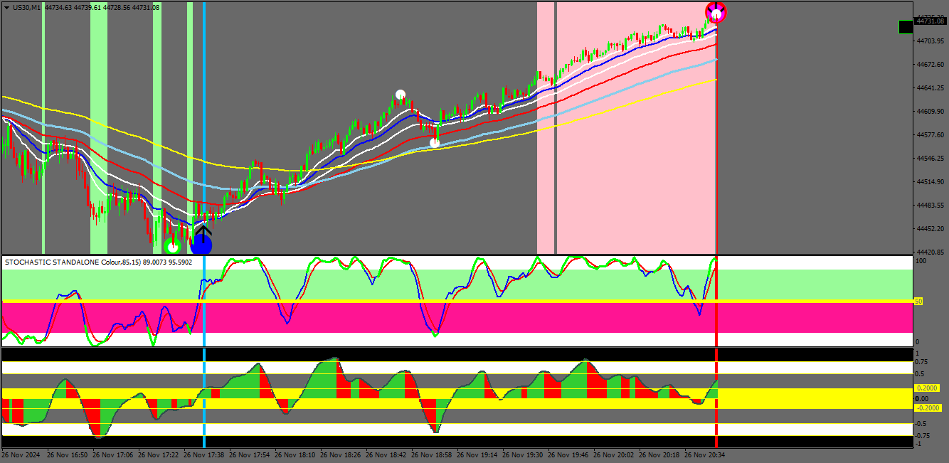 I have also added a background zone indicator to show when stochs 233 is over 95 (pink) or under 5 (palegreen). It just gives a better chance of winning trades.