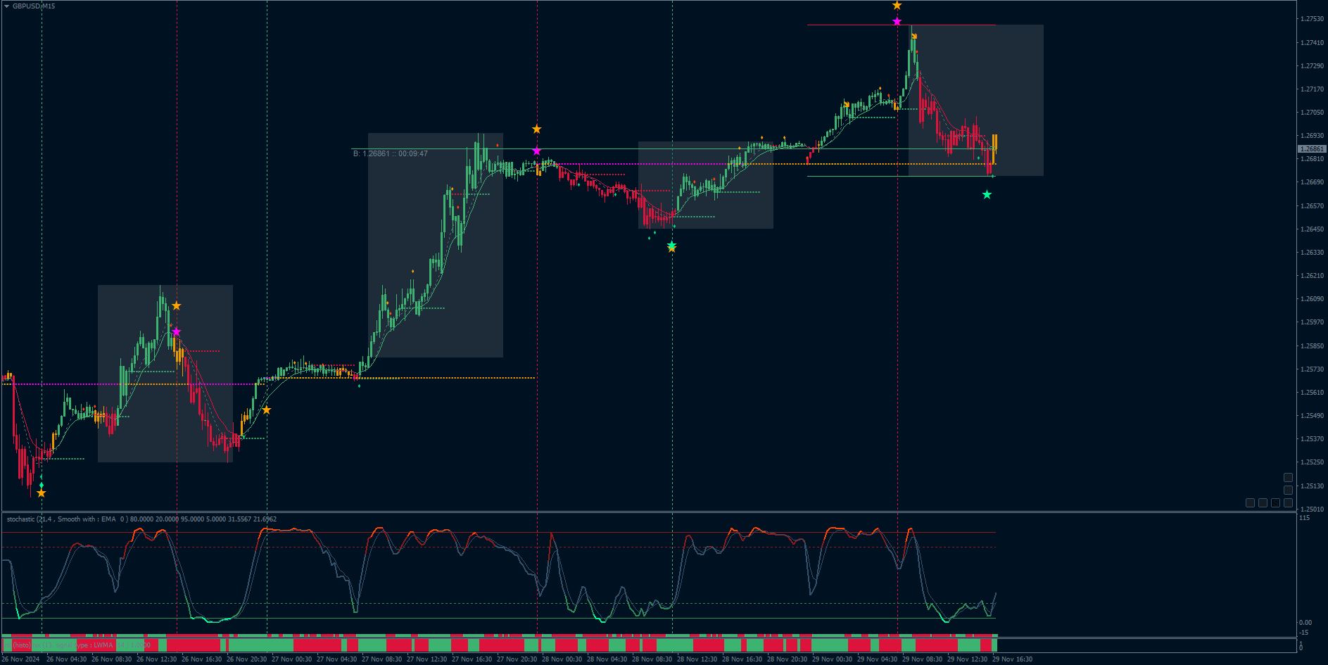 Here is a 15m / 4H version similar to boytoy's 1h / D1 version. I just changed small things and added rsi signals which i like.