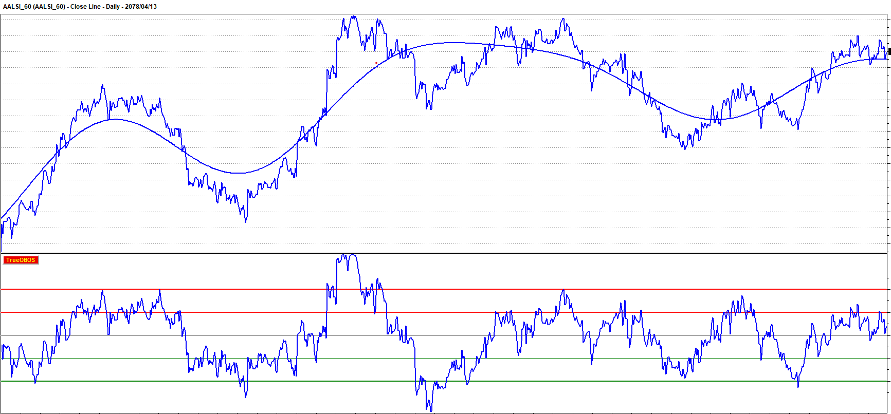By way of background this is my attempt to emulate the TrueOBOS indicator of the CycleTrends software. Instead of using a high number of harmonics (eg 400 I use two or three and tweek the number of past bars around 1000. I am not concerned with the predictive aspect of the indicator.