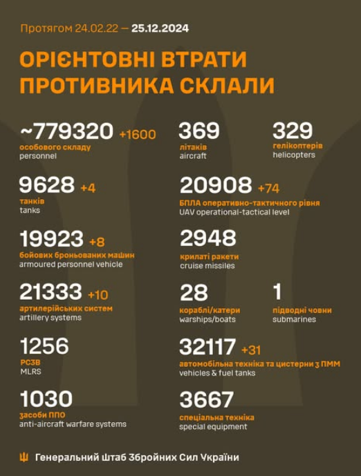 The estimated total combat losses of the enemy from 24.02.22 to 25.12.24 amounted to / The estimated total combat losses of the enemy from 24.02.22 to 25.12.24