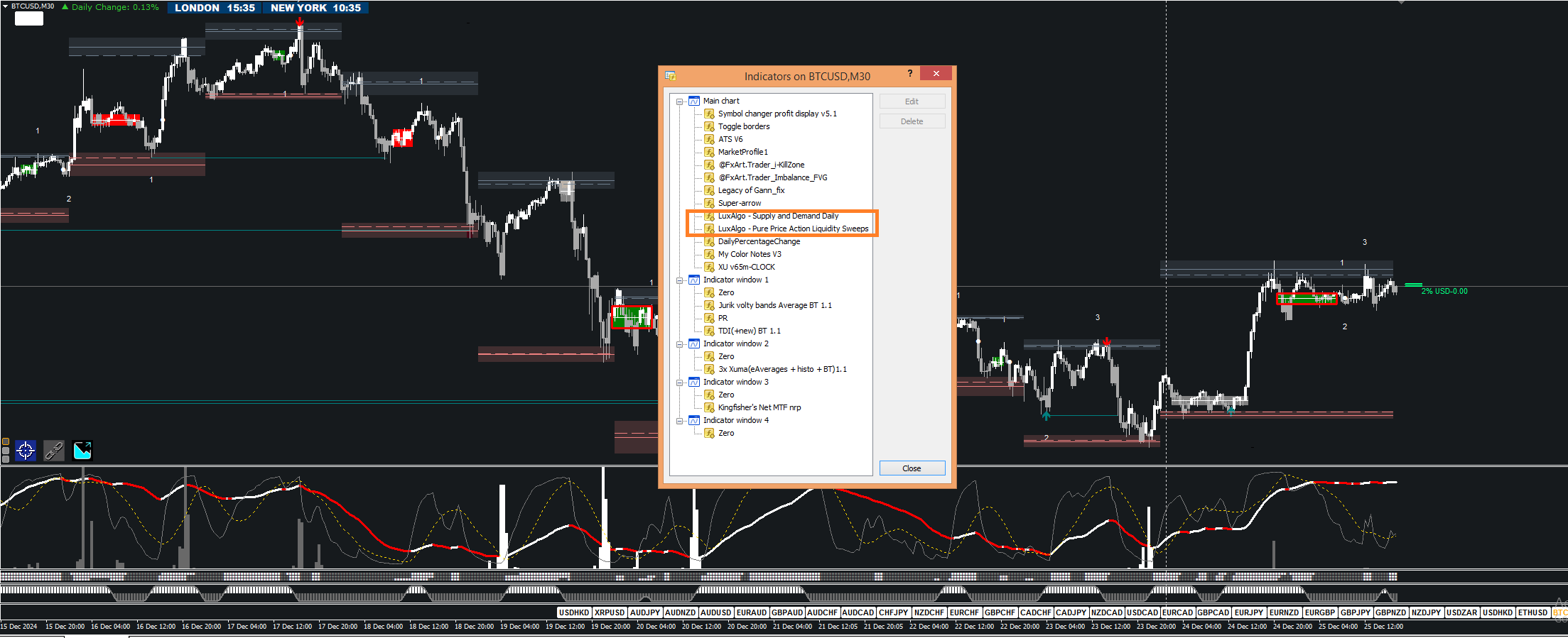 You are missing 2 indicators LuxAlgo - Pure Price Action Liquidity Sweeps and LuxAlgo - Supply and Demand Daily in the VZU folder!this is free version so when it doesn't appear often switch to another time frame it will appear again
