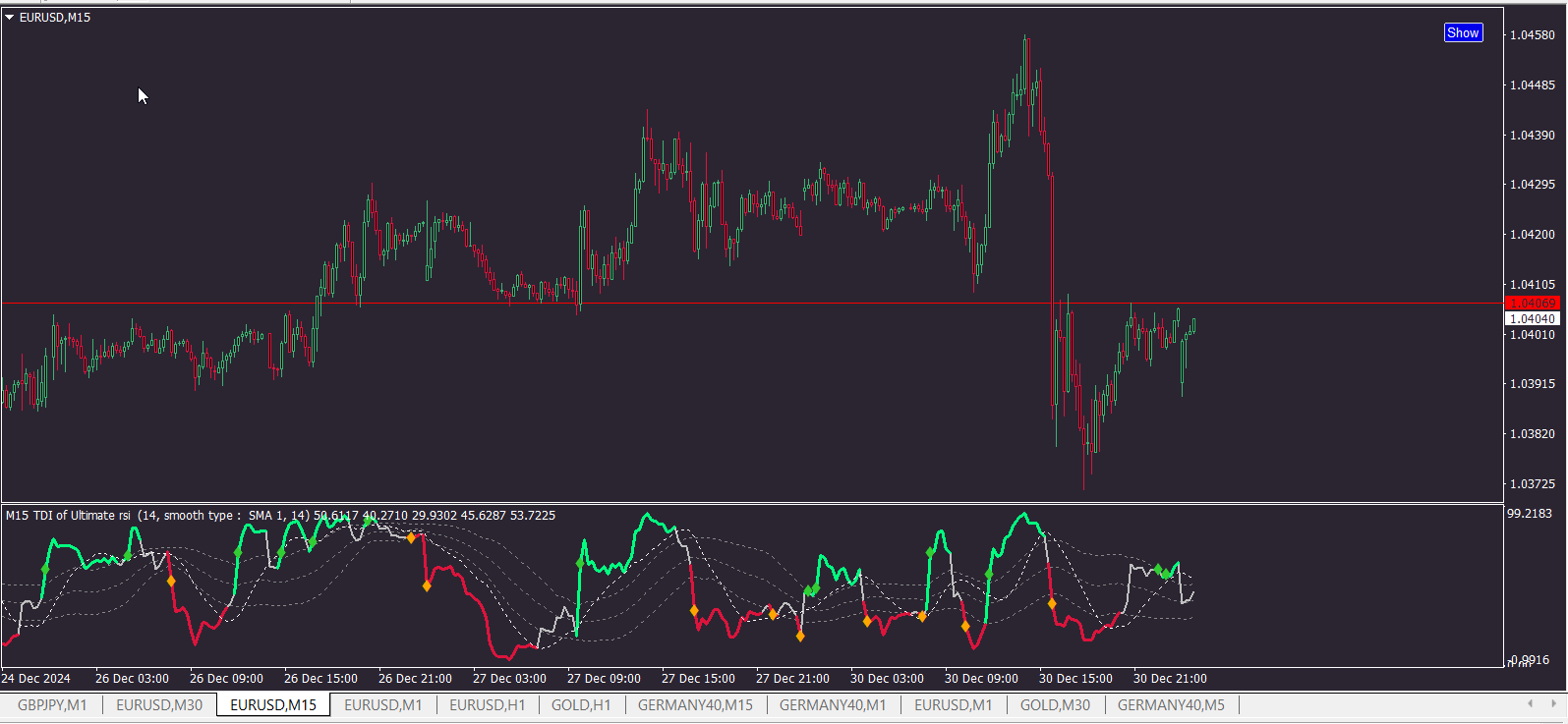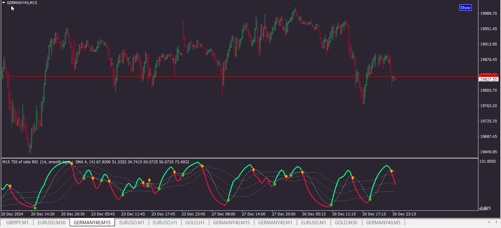 Extended TDI indicator with Arrows in the SubwindowTaxijason wrote: Mon Dec 30, 2024 7:40 am Here is another picture for reference with Red and Green Arrows (Diamonds), instead of all Black, to show more clearly that the arrows should fire when the RSI crosses below the Signal Line (Shown with Red Arrows) and Arrows will fire when the RSI crosses above the Signal Line (Shown with Green Arrows).