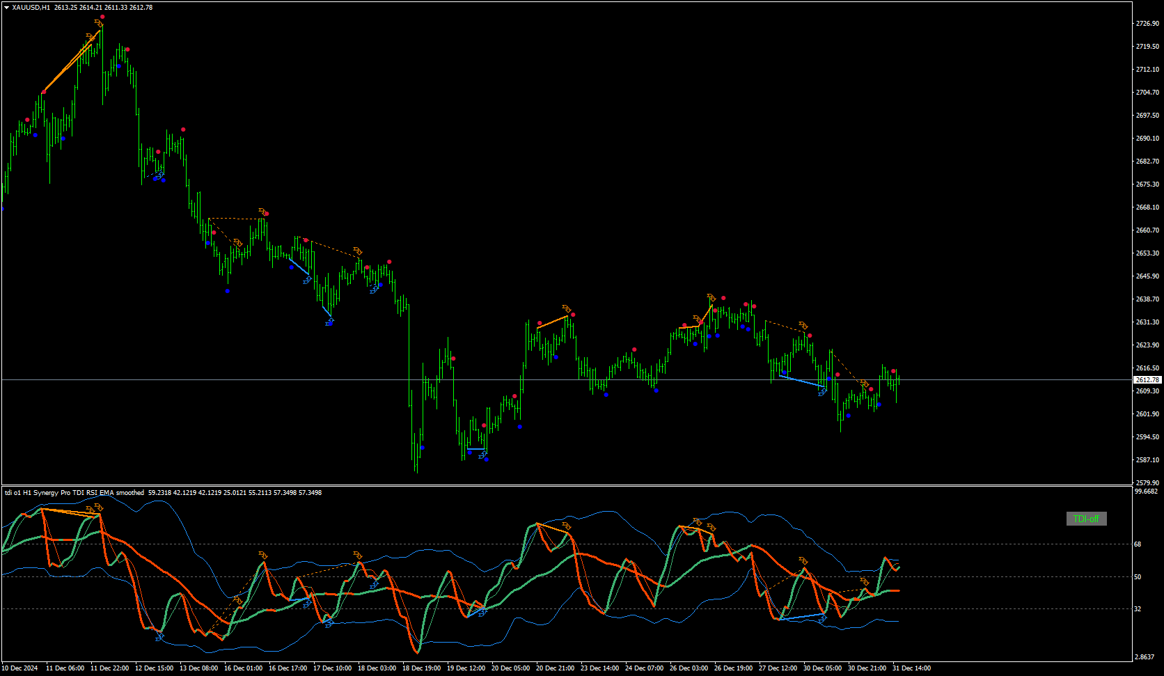 TDI Divergence indicator with color change on slope for both RSI'ssmkale123 wrote: Tue Dec 31, 2024 1:42 am ! TDI RT Synergy Pro avgs - smth (mtf + filtered + divergence + alerts + arrows).ex4