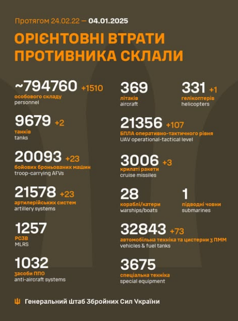 The estimated total combat losses of the enemy from 24.02.22 to 04.01.25 were approximately /