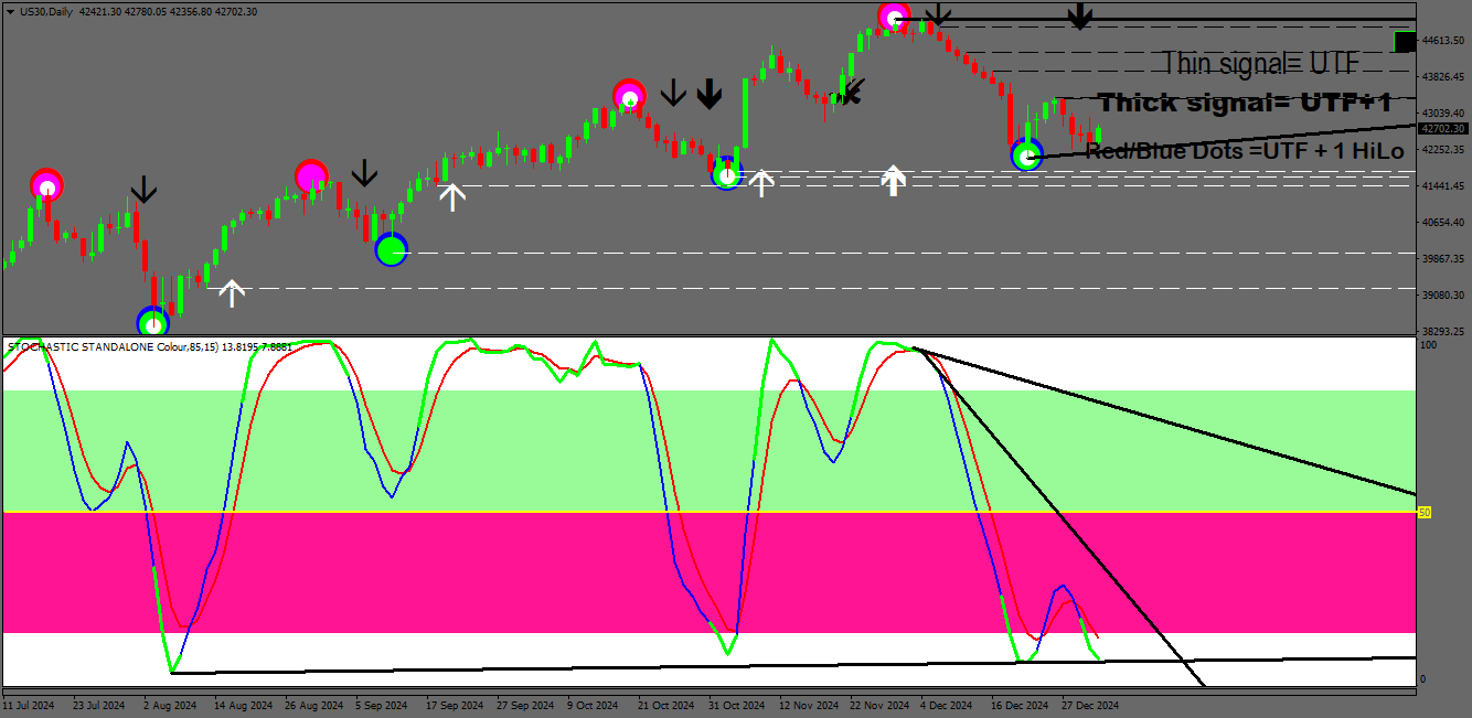 I have shown the way that the STOCHASTIC indicator is used for this weeks trading of the DOW.