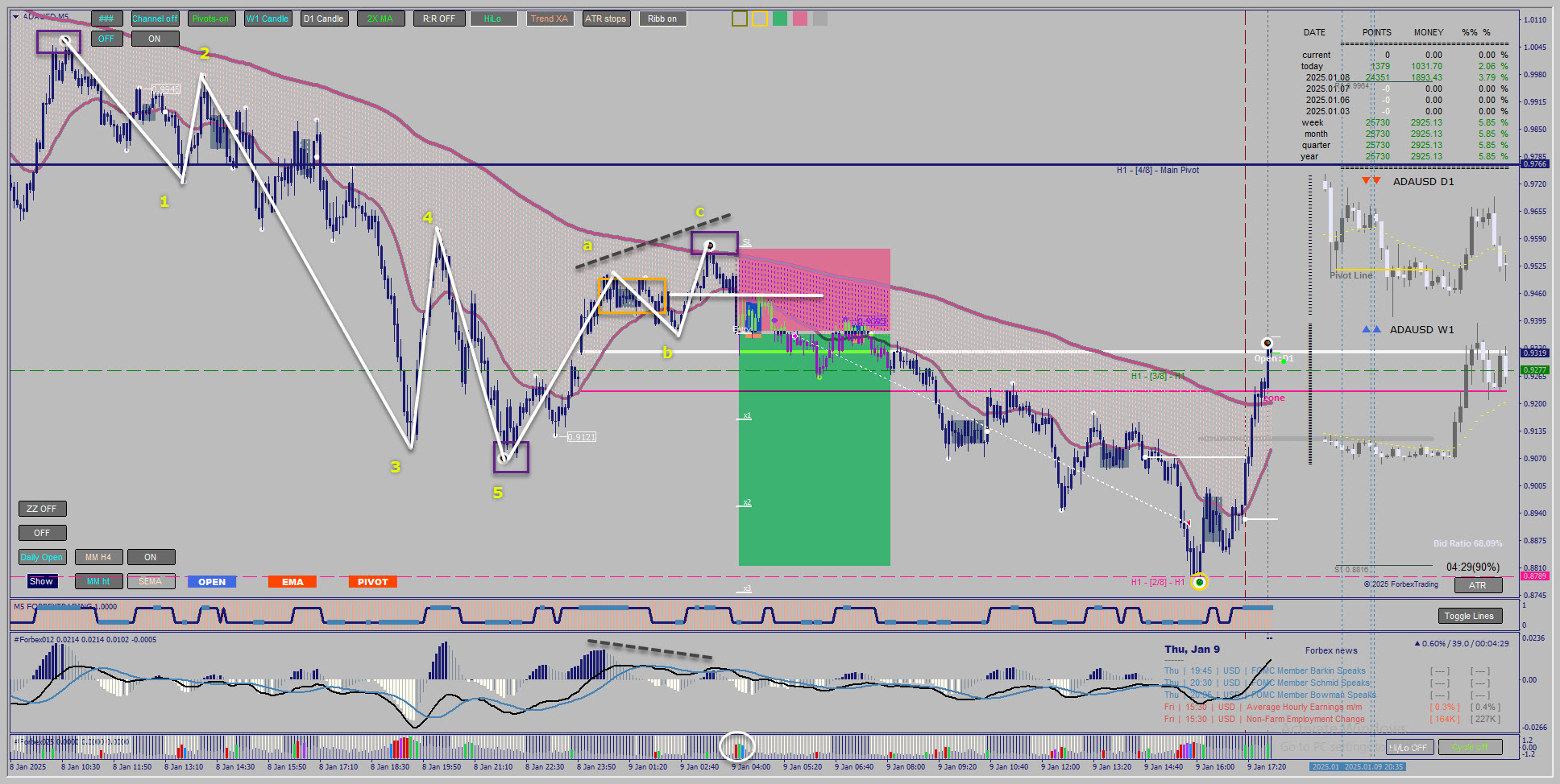 The ADAUSD chart shows a strong bearish structure, marked by a completed Elliott Wave pattern. The trade setup appears well-structured; however, the lack of a decisive break below the Daily Open Line remains a critical factor for full bearish confirmation.
