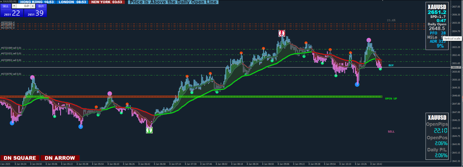 4. Watching for the triangle pattern (two dots indicating market structure).
