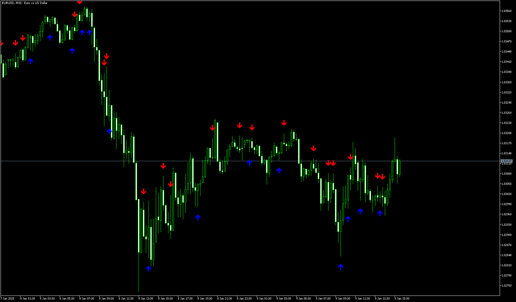 - If the current Low is lower than the "previous low" and the Close is higher than the Open it'll display an up arrow
