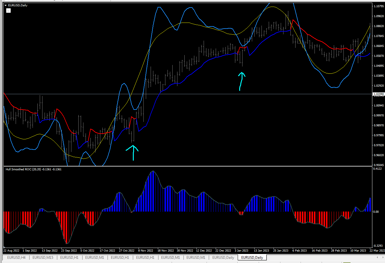 I want to make a filter for false breakouts in order to open trades against them. Fast moving averages that are ahead of price are good for this.They made hma-roc on chart and I like this filter. Maybe experts know how to improve and make such a moving average even more accurate?