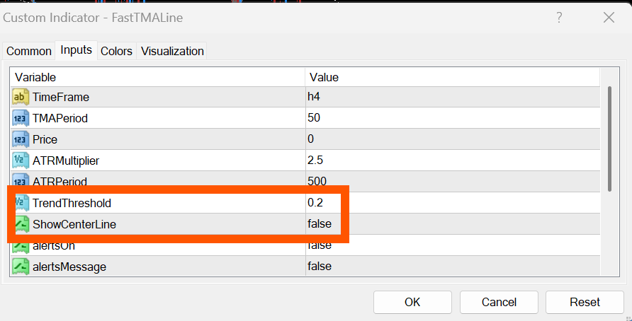 Finally, the center line color should be selectable and change in accordance with the slope threshold setting, as in the FastTMAline indicator.