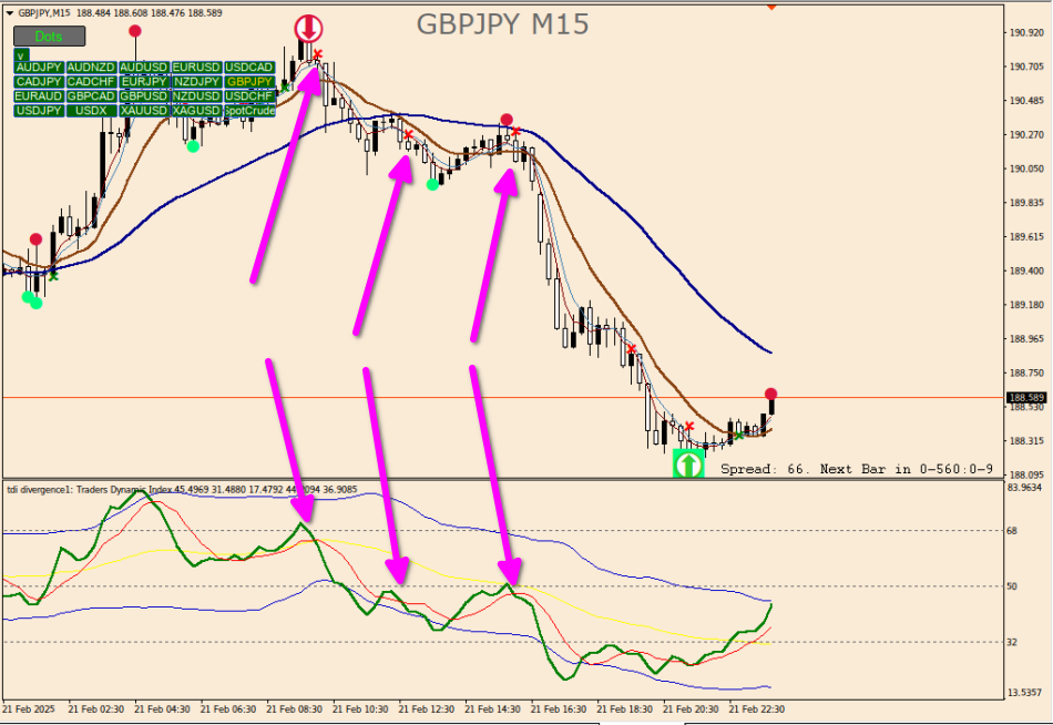 Here's an indicator showing the spot where the tdi (based on rsi) rolls over the slower lines (green over red and gold).