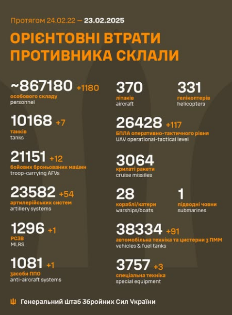 The estimated total combat losses of the enemy from 24.02.22 to 23.02.25 were approximately /