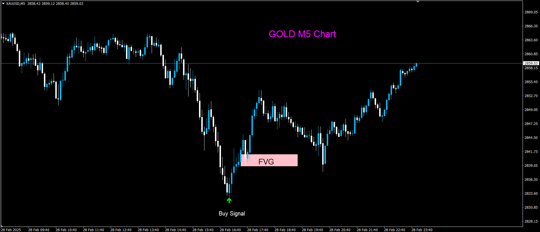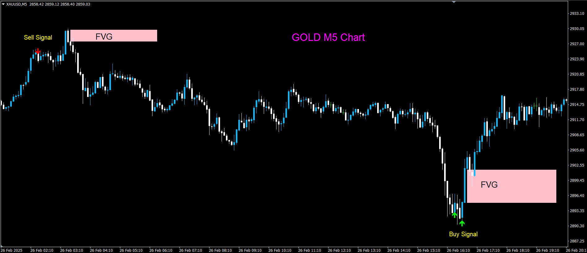 - After an arrow appears, wait for a Fair Value Gap (FVG) on the price chart.