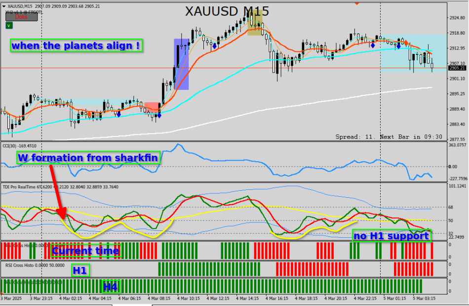 The yellow squiggles are me showing my bread and butter trading, the M and W patterns off the TDI. (coming off the sharkfin then second leg inside the bands). As per the method rules the second leg needs to cross both the MBL and the signal line.