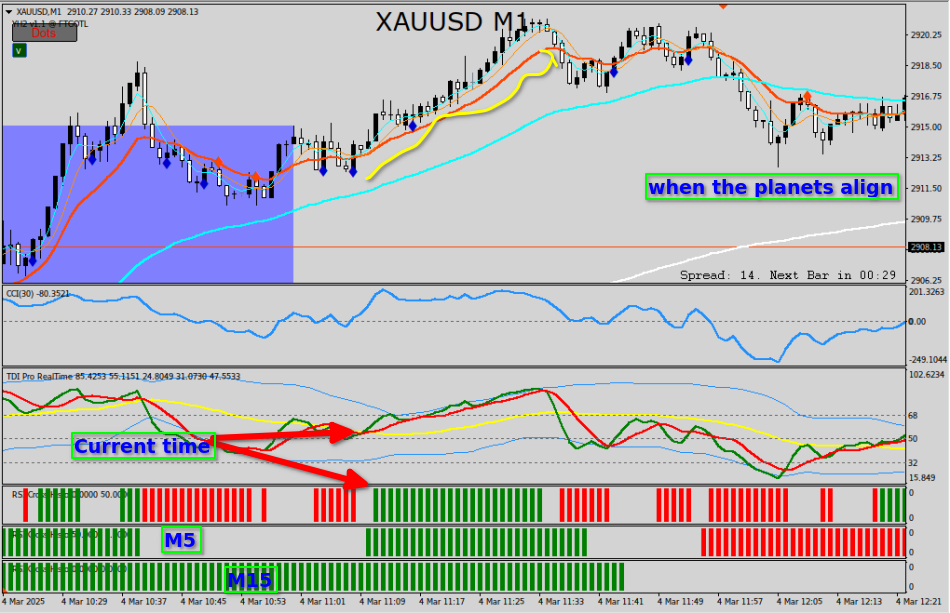In the picture above, you can see how the indicator showing M15, H1 and H4. They are all matching at the entry point.