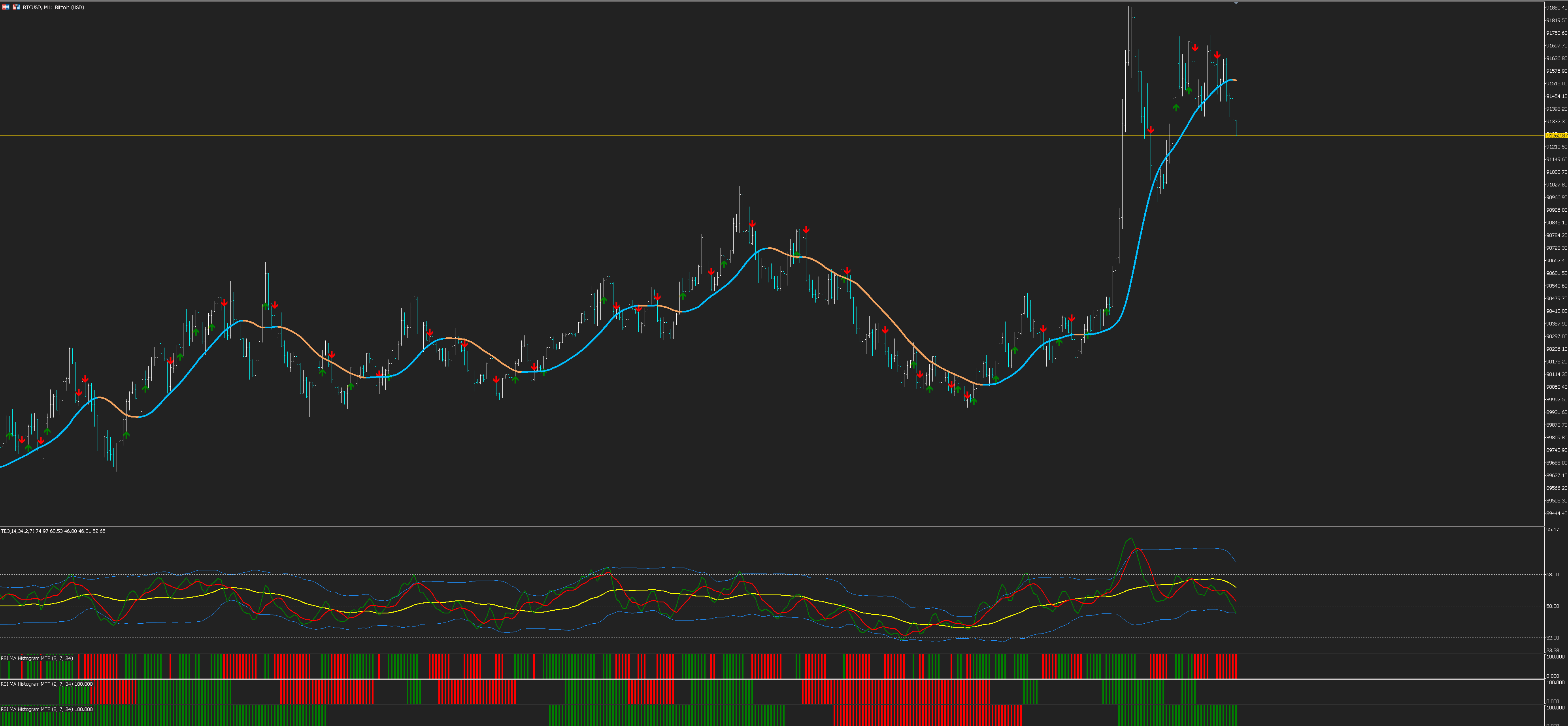 Inspired by the Traders Dynamic Index (TDI), the RSI Cross Histo MTF indicator fuses RSI with three moving averages (MAs) to deliver trend signals. In the Traders Dynamic signals are generated when the Fast RSI line crosses the Signal line or the Baseline, indicating shifts in momentum.