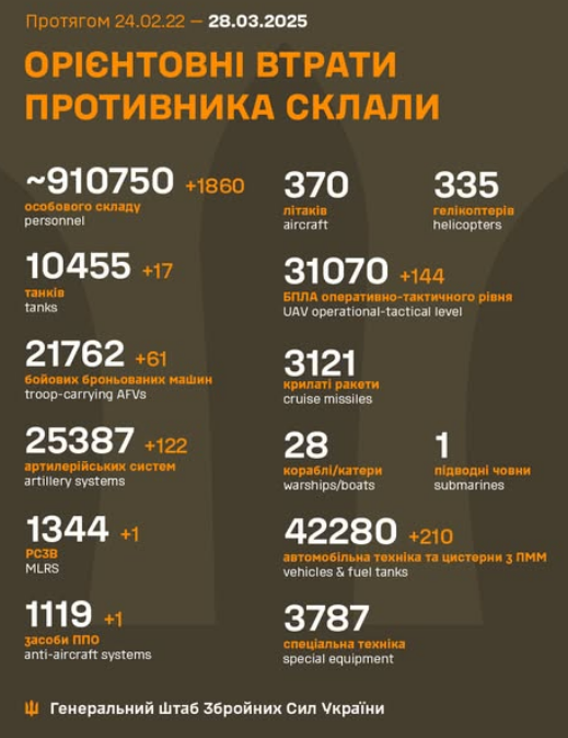 The estimated total combat losses of the enemy from 24.02.22 to 28.03.25 were approximately /