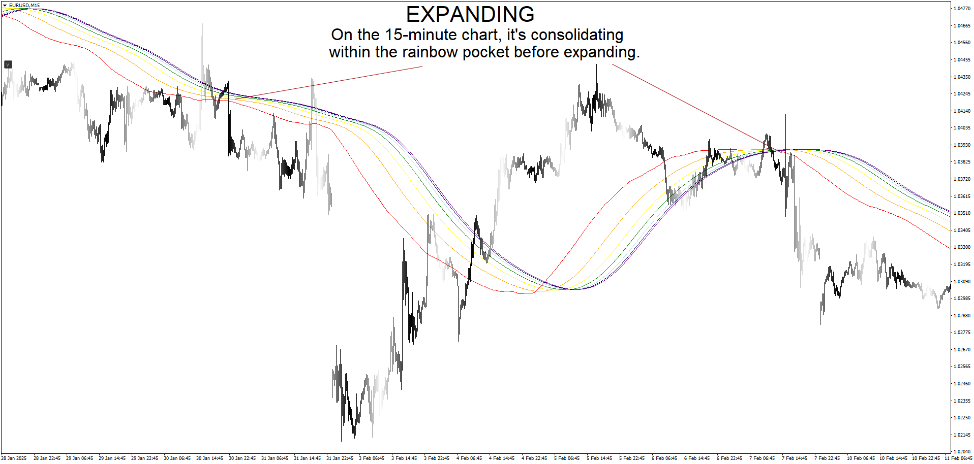 - On the hourly chart, these levels serve as strong reversal points, while on the 15-minute chart, consolidations within the rainbow pocket followed by breakouts can signal high-probability trading setups.