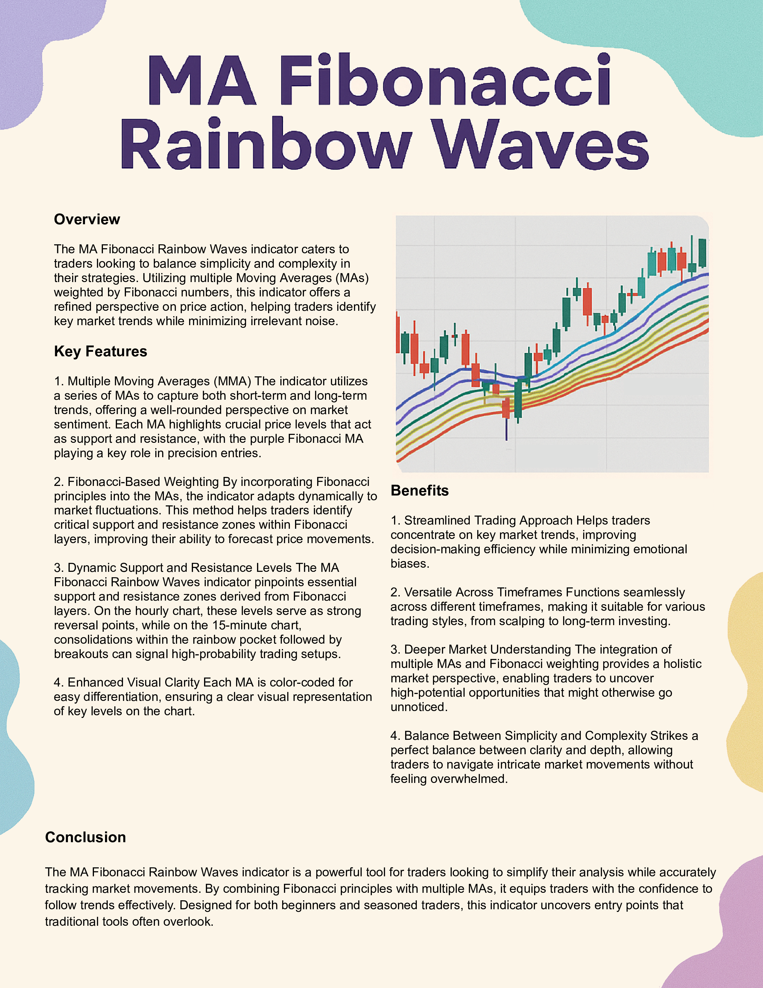 - The MA Fibonacci Rainbow Waves indicator pinpoints essential support and resistance zones derived from Fibonacci layers.