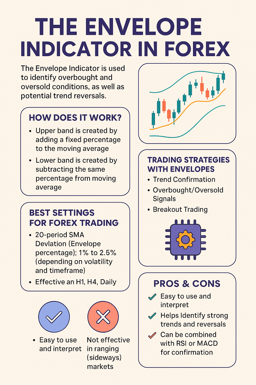 - Swing Trading: Traders might use the envelope to spot potential reversals or corrections within a range-bound market.