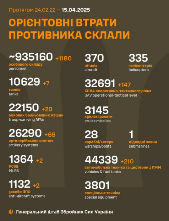 The estimated total combat losses of the enemy from 24.02.22 to 15.04.25